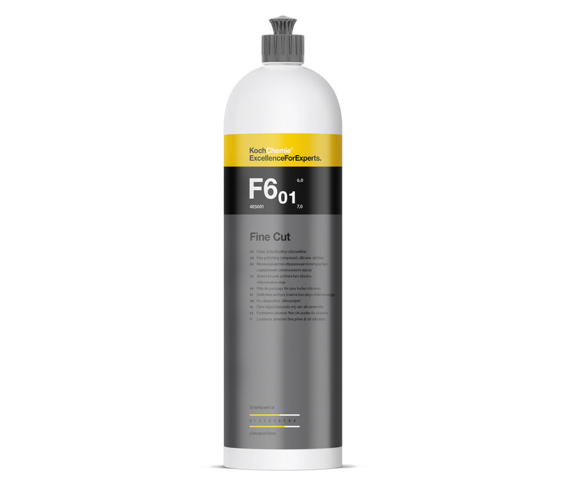Intelligent machine polish of the latest generation with unique aluminium oxide quality. The intelligent grain size ensures very quick, complete removal of wash system scratches and similar traces of use and gives the paintwork a long-lasting deep sheen. Sanding marks left behind by 2500 grade sanding media are removed effortlessly. Fine Cut F6.01 is therefore ideally suited for perfect reconditioning of medium to heavily weathered paintwork. Perfectly coordinated for the treatment of scratch-proof paint. (please note, price is for a single bottle, picture is just to illustrate both sizes)