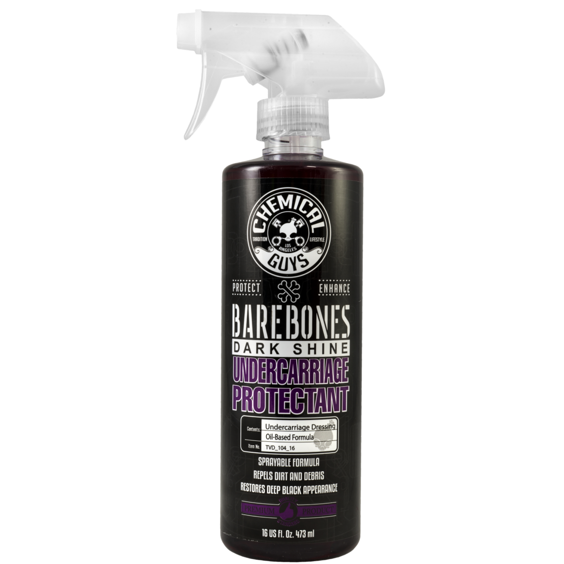 The oil-based formula sticks to any surface for improved durability. The sprayable dressing is designed for undercarriages, wheel wells, sub-frames, springs, suspension components, fender liners, and even bumper covers. Bare Bones keeps your undercarriage trim looking great while resisting road grime, dirt, dust, tar, and moisture while driving. Bare Bones uses premium ingredients that finish with a dry-to-the-touch feel within minutes. Now any undercarriage can stay looking great with Chemical Guys Bare Bones.